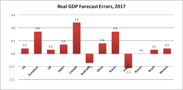 In 2017, for the first time in years, forecasters underestimated global real GDP growth. Average real GDP growth for the twelve countries we monitor is now expected to be 3.6% compared with a consensus forecast of 3.3%. In the twelve economies, real GDP growth exceeded forecasters' expectations in nine and fell short of expectations in just two. The weighted mean absolute forecast error for 2016 was 0.43 percentage points, down slightly from the 2016 error.
